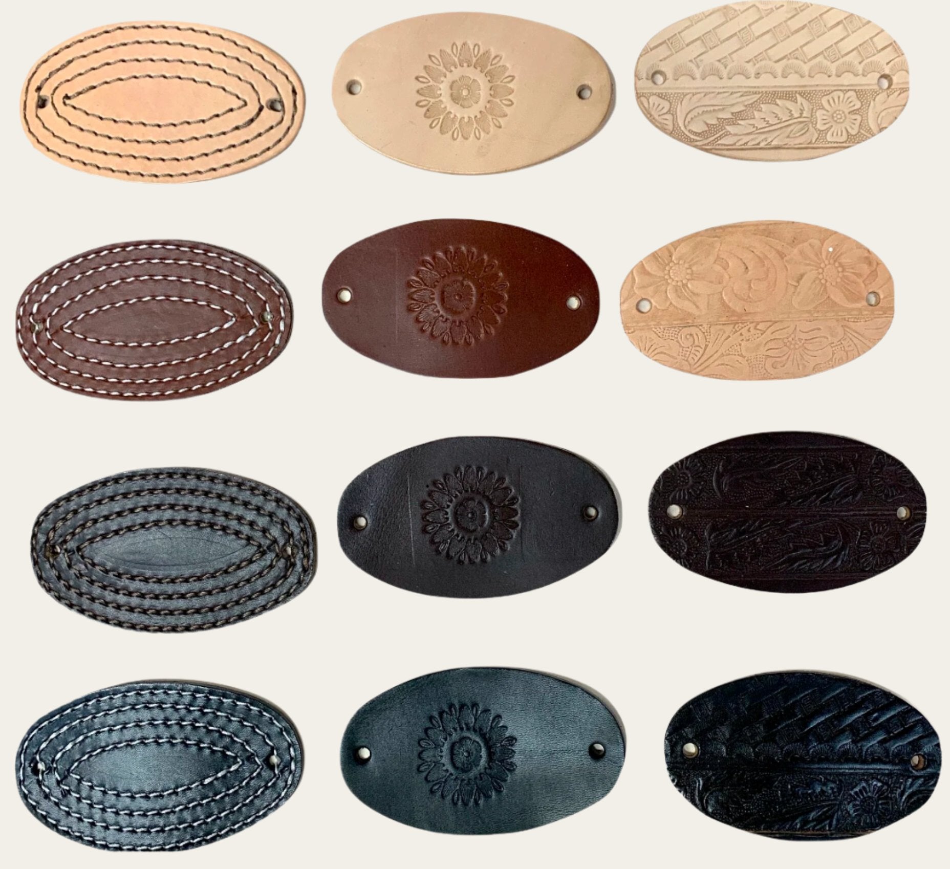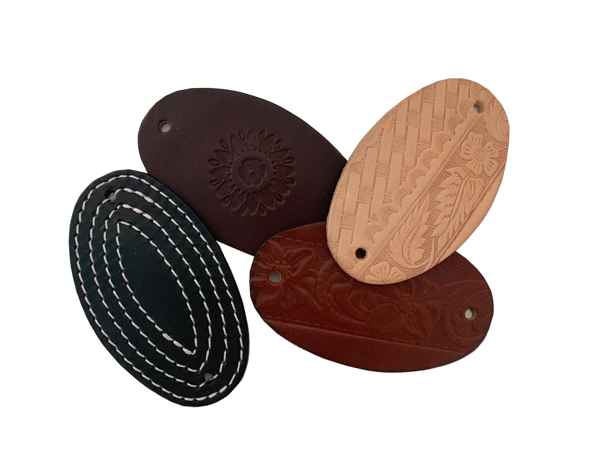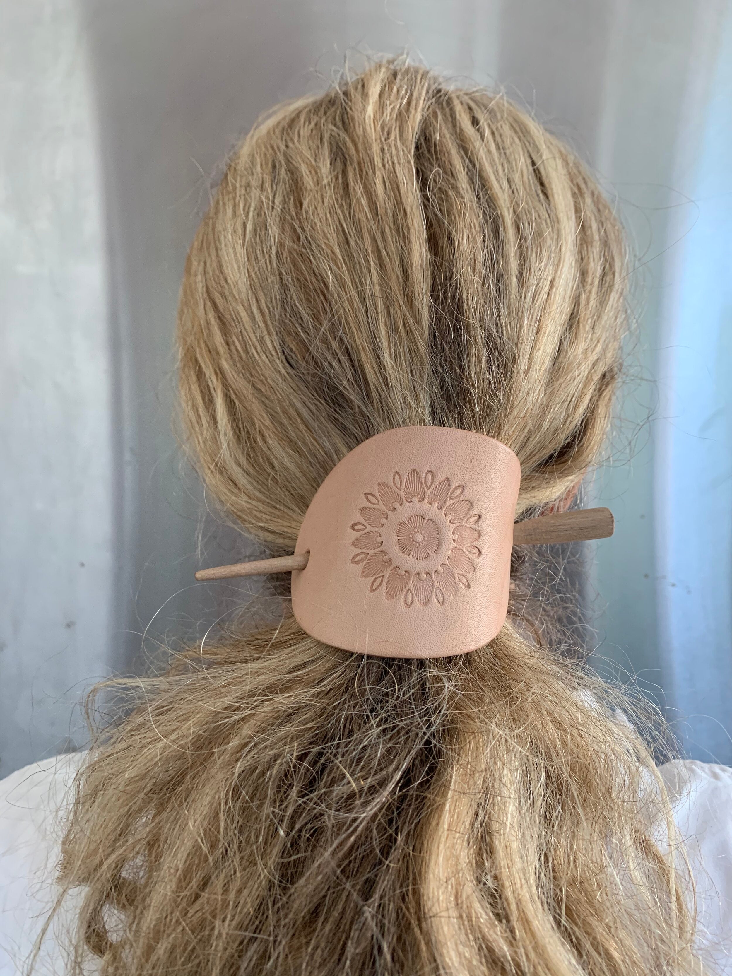 Our leather hair barrettes come in three distinctive designs: stitch, flower, and a mix of hand-tooled patterns. They can be purchased individually or in sets of three.